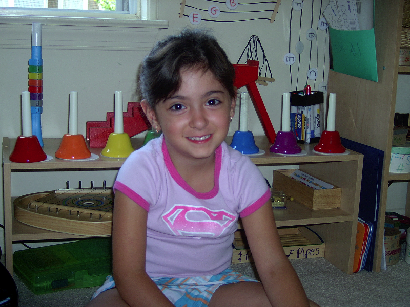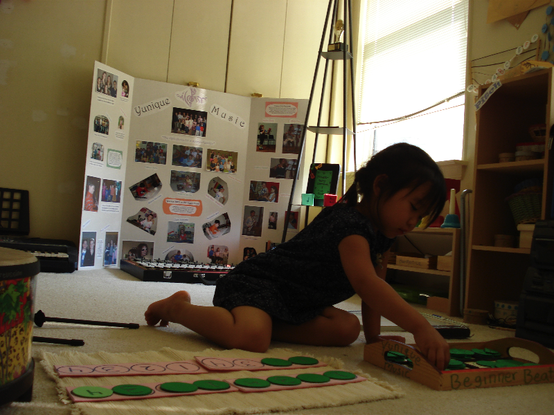 A four-year-old does a Montessori music work